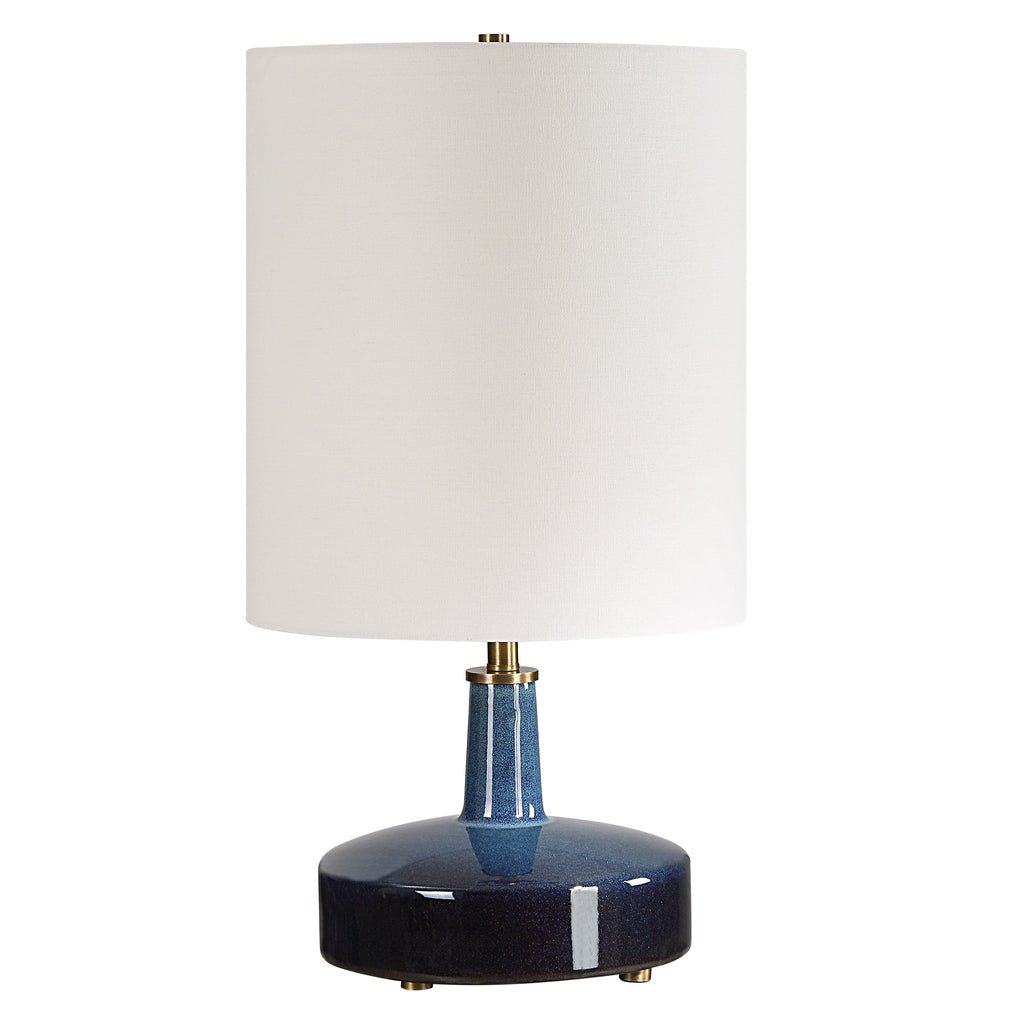 Material: Add a touch of artistic flair to your space with our unique ceramic table lamp, boasting a captivating ombre effect from light blue to midnight blue. The granulated finish adds depth, while brass-plated details provide a hint of elegance.