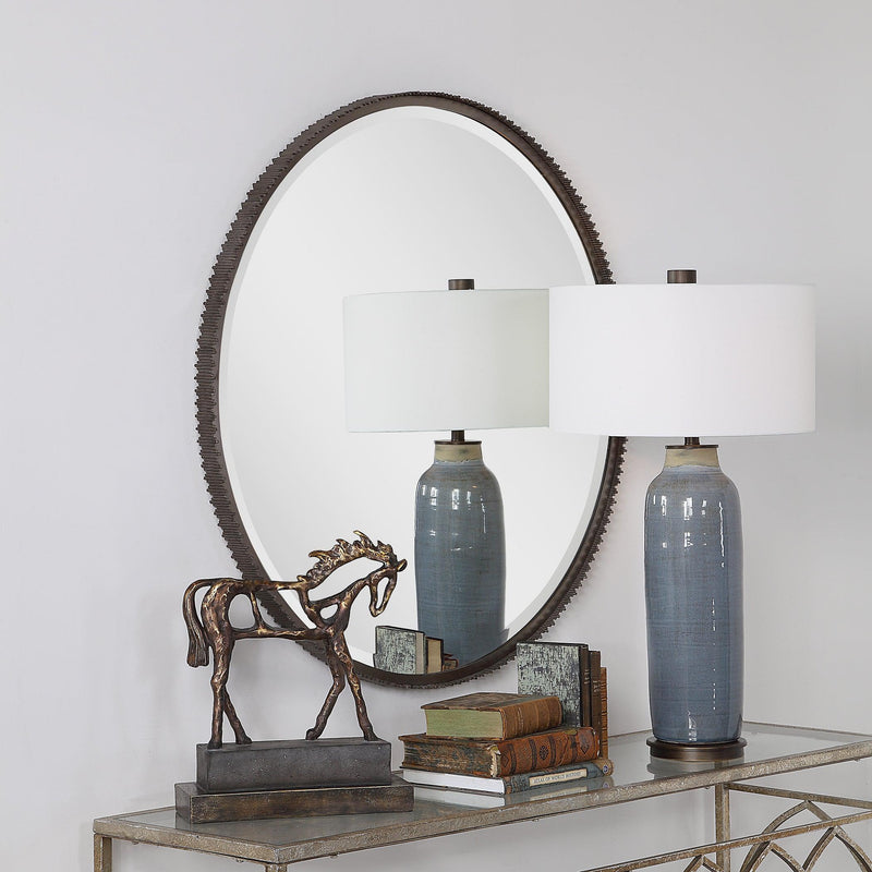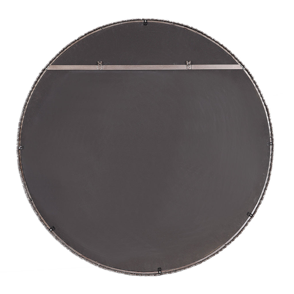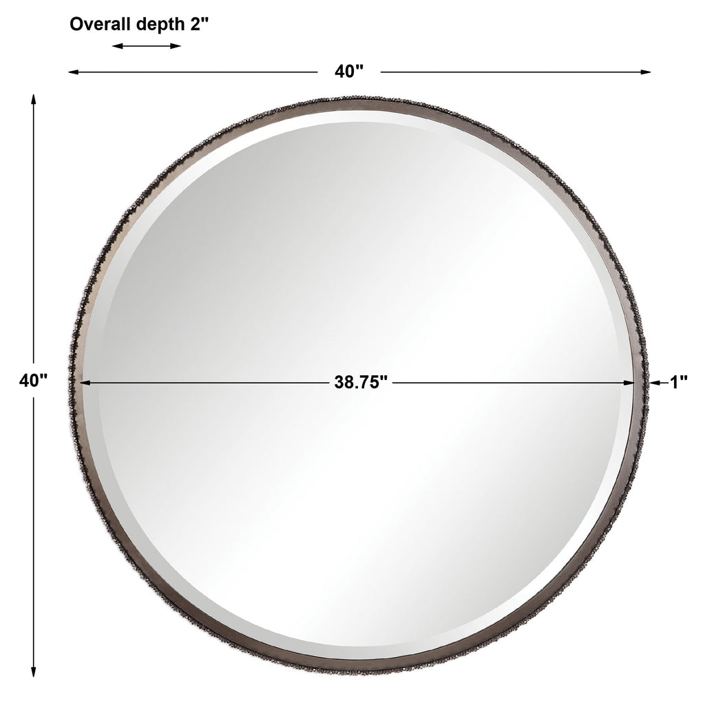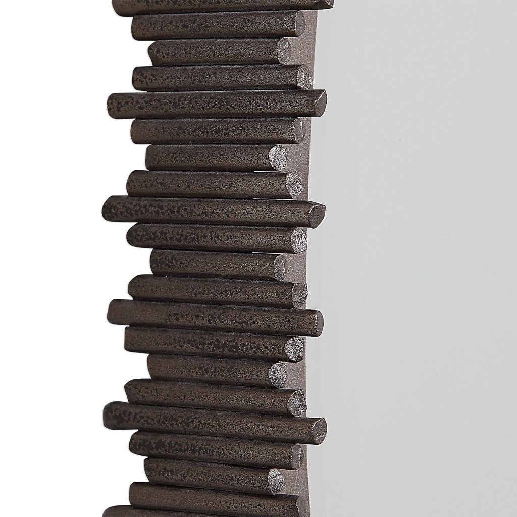 Material: This 3-dimensional contemporary mirror features hand cut iron dowels in varying lengths welded to the outer edge of the frame, finished in a burnished steel silver. The mirror is surrounded by a considerable 1 1/4" bevel.