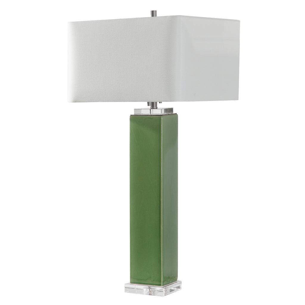 Material: Finished in a striking tropical green glaze, this ceramic table lamp is accented by thick crystal ornaments and brushed nickel accents.
