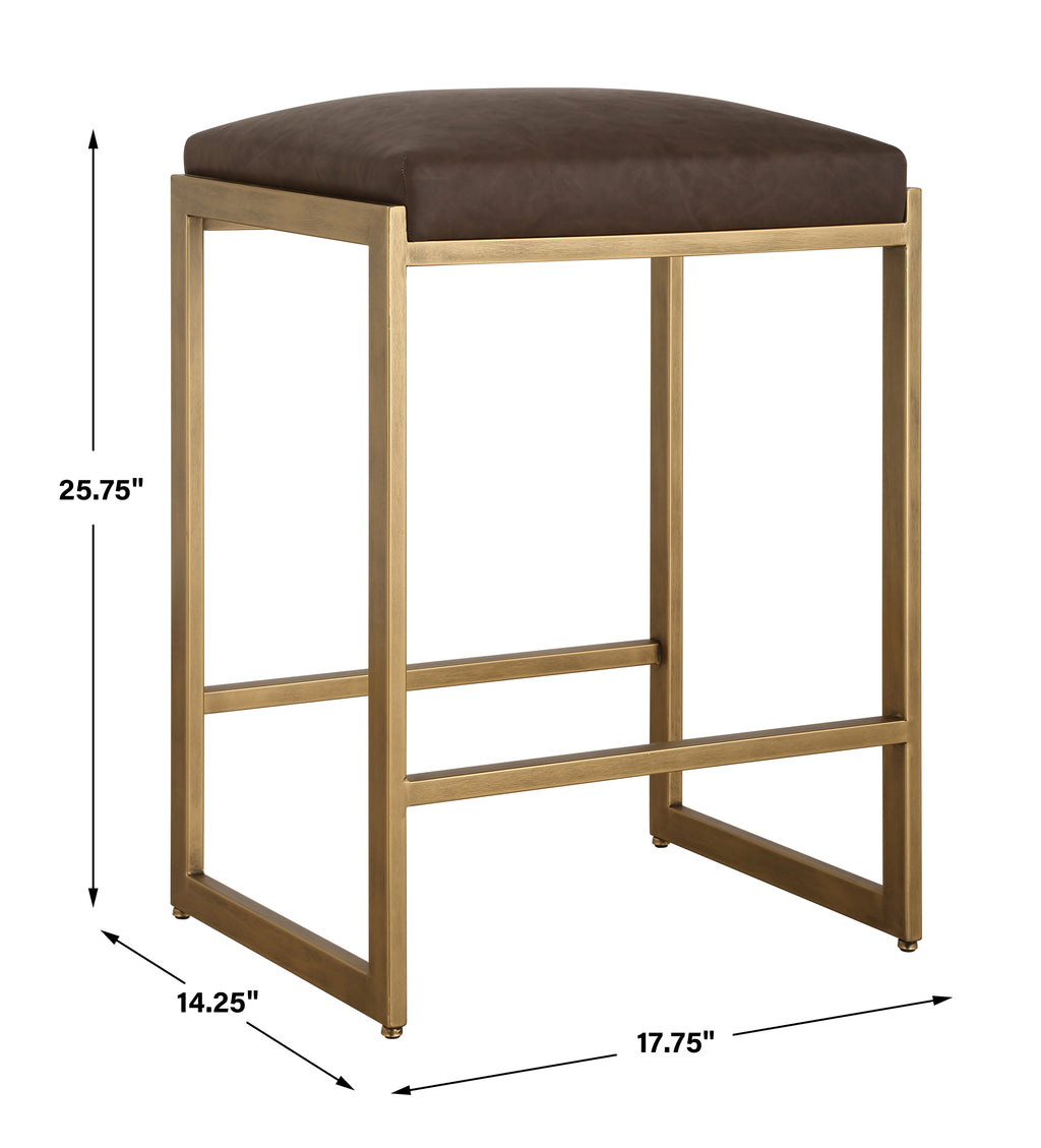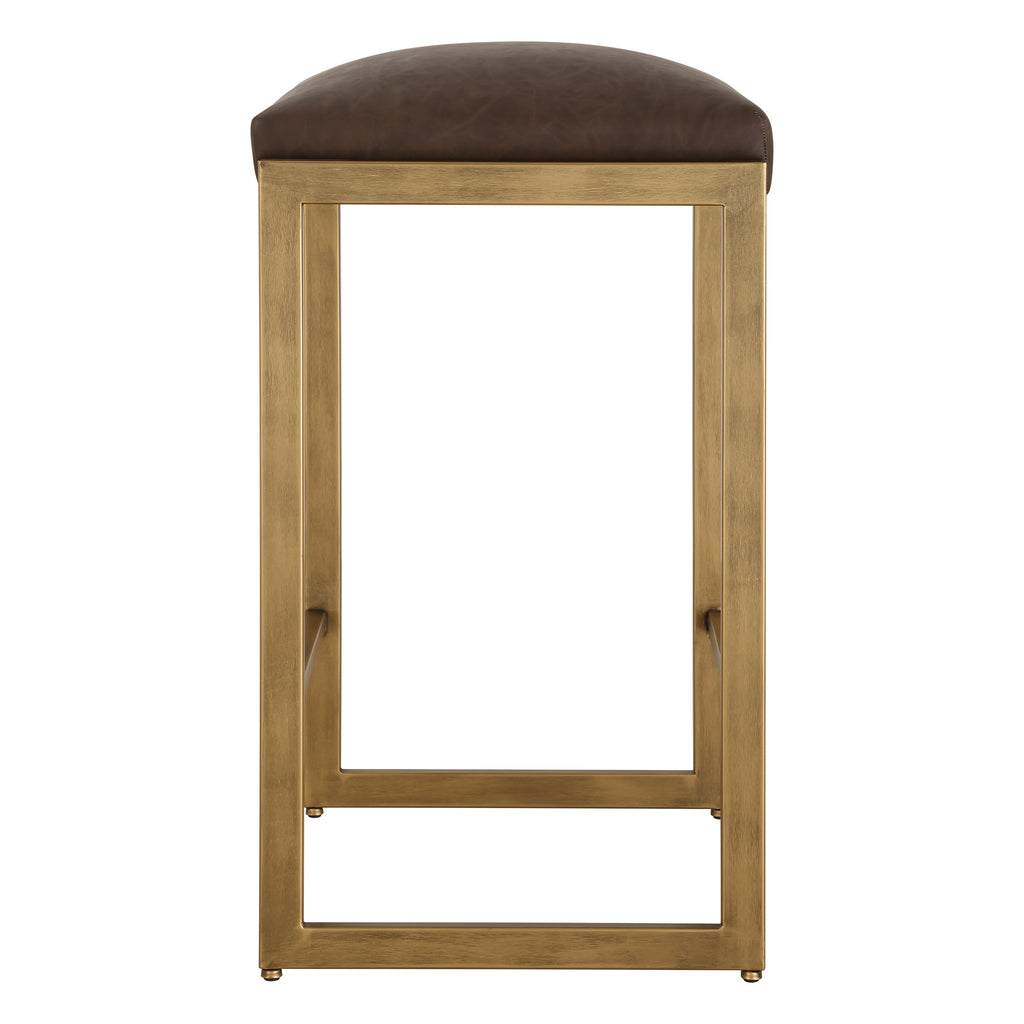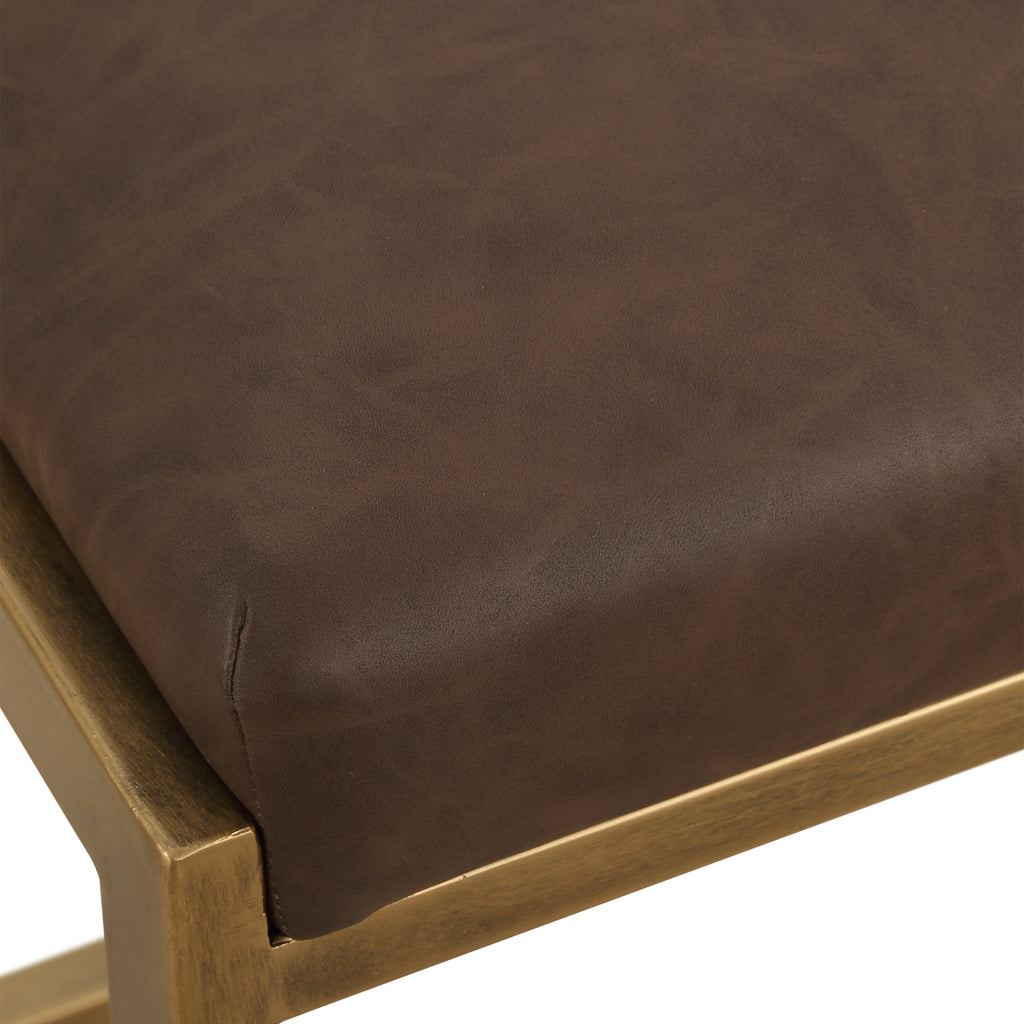 Material: Clean contemporary lines are accented with subtle stylish details. The antique brushed brass finished iron is complemented with an inset cushion upholstered in a rich cocoa faux leather.