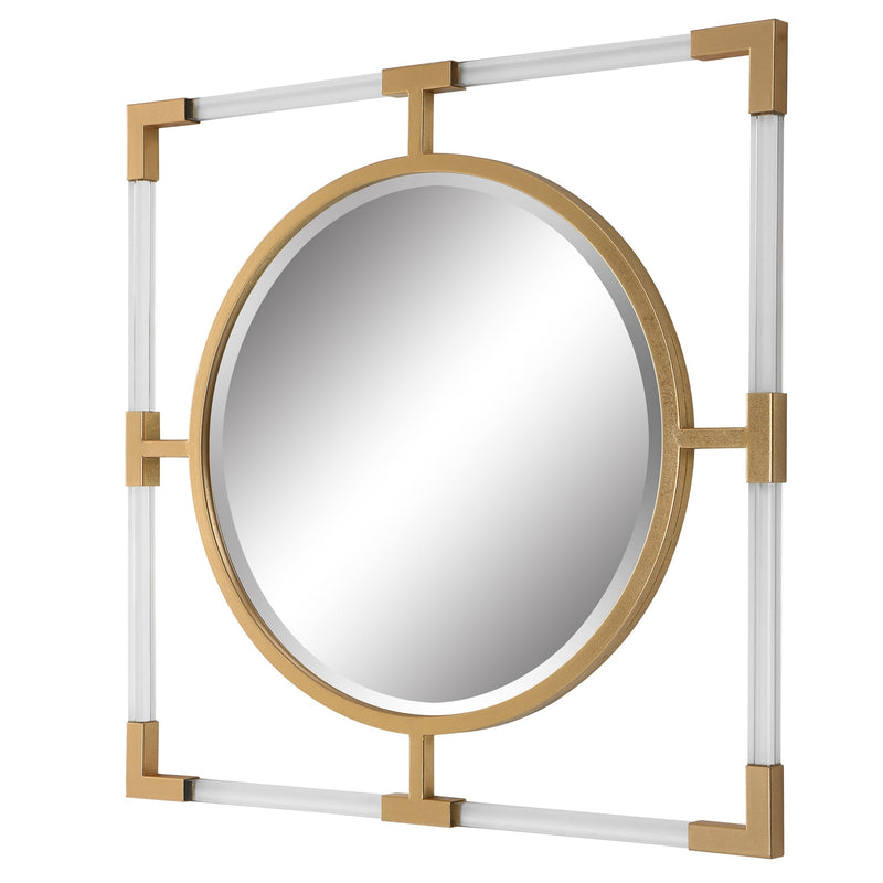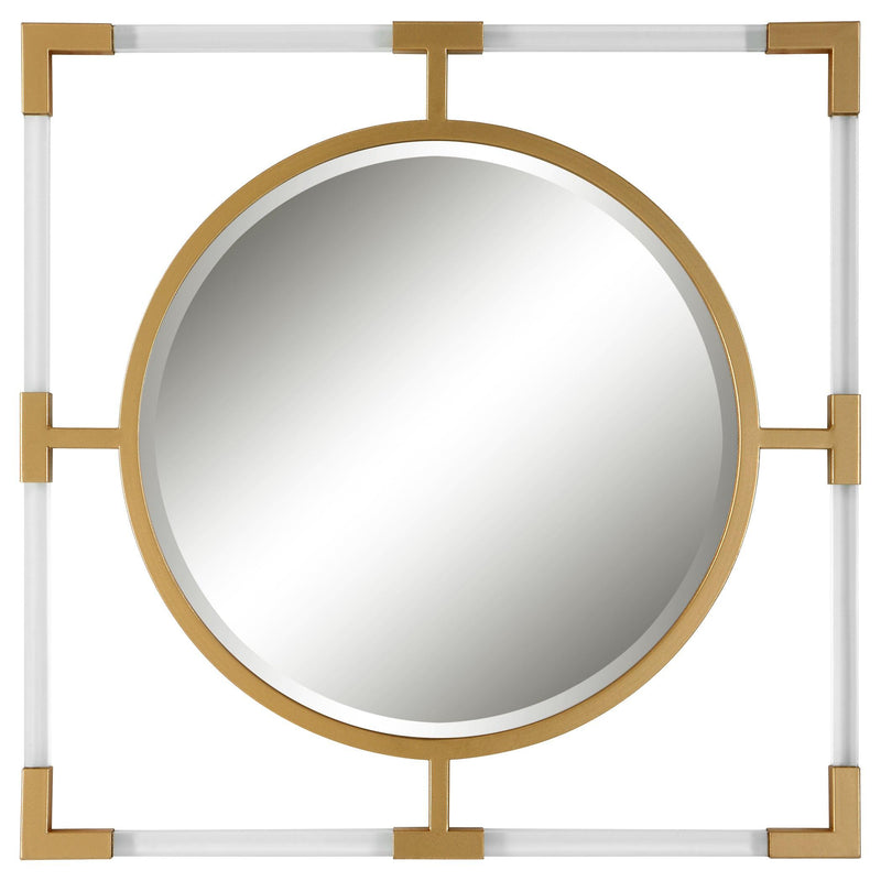 Material: The balkan small mirror looks great alone or paired with multiple for a stunning display. The forged iron frame is finished in a metallic gold leaf, with suspended, clear acrylic, solid bars creating a modern feel. Mirror has a 1" bevel.