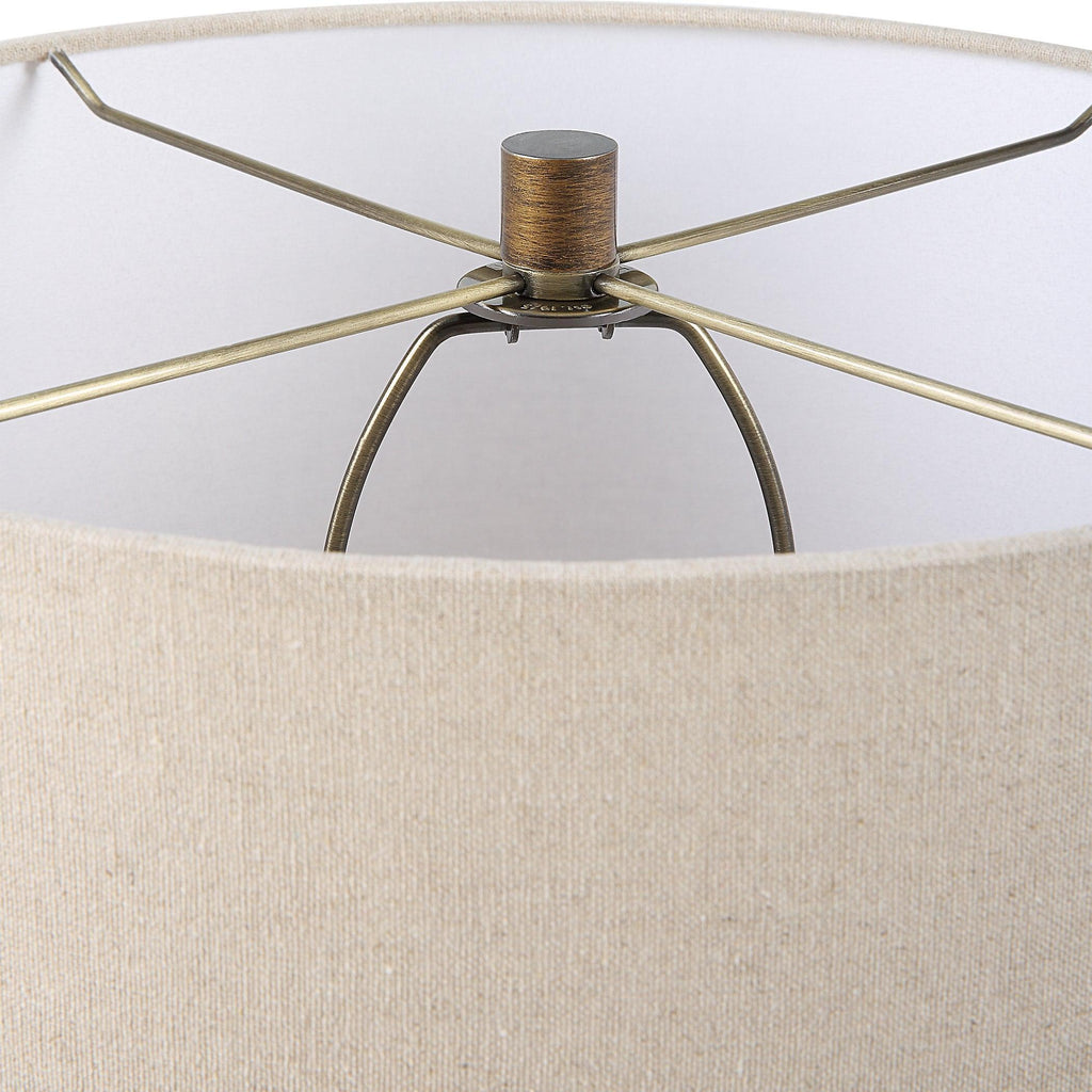 Material: The baltic table lamp showcases a dark amber, teardrop glass base accented with rustic bronze details.