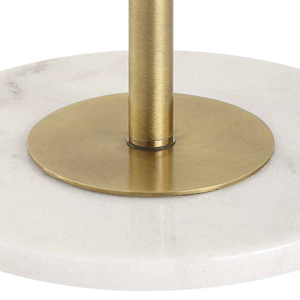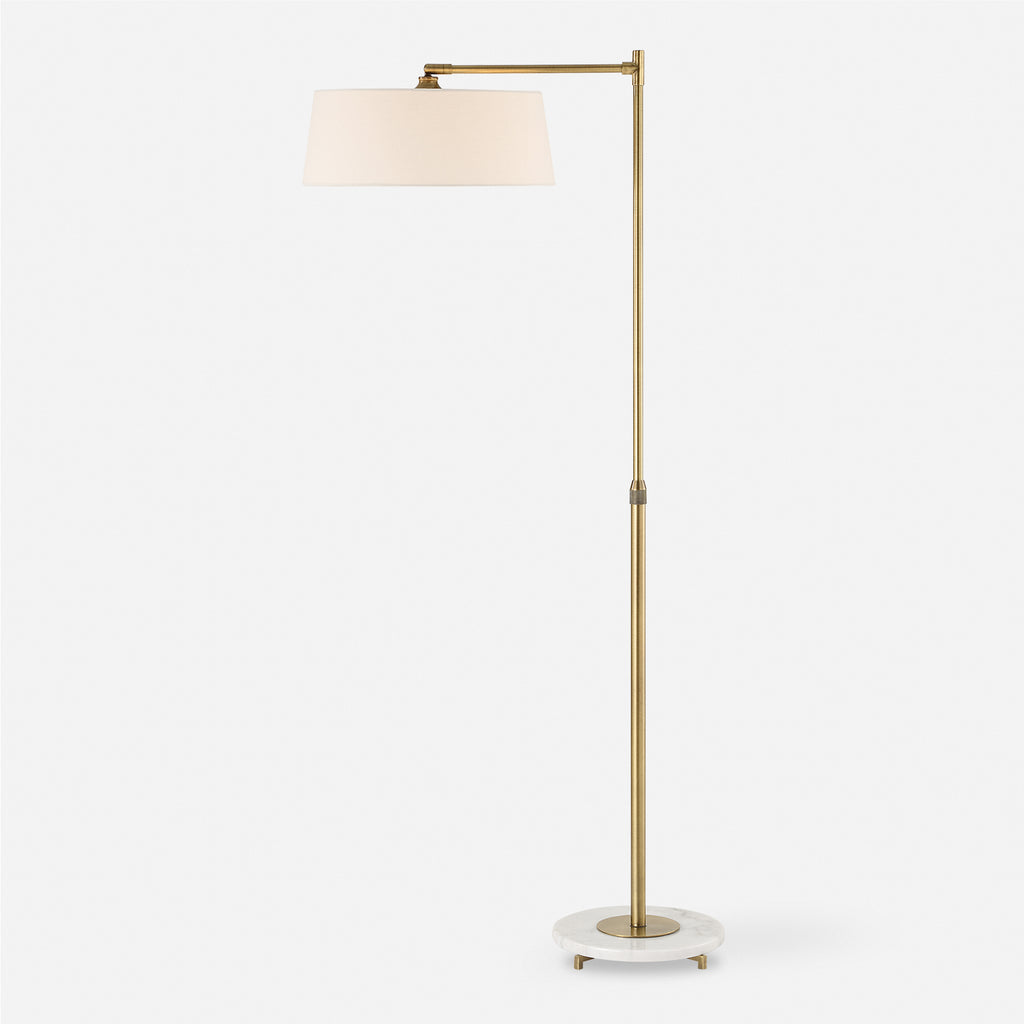 Material: This refined floor lamp is crafted from iron finished in a plated antique brushed brass, attached to a white marble foot. The branch out floor lamp features a telescoping neck that allows it to go from a 48" tall reading lamp to a 67" tall floor lamp. It also features a pivoting shade.