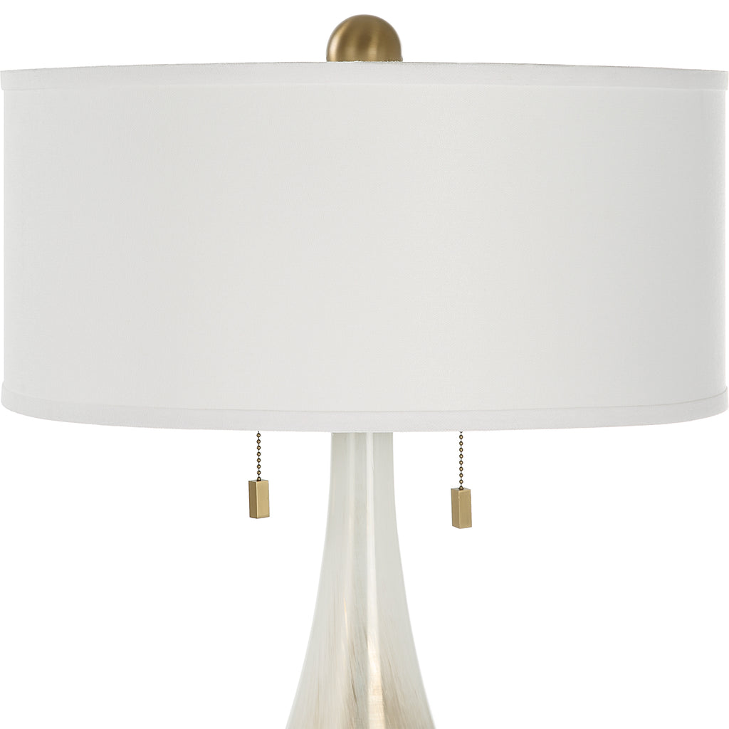 Material: Gloss white glass featuring metallic smoked bronze hues accented with plated brushed brass metal details and a thick crystal foot.
