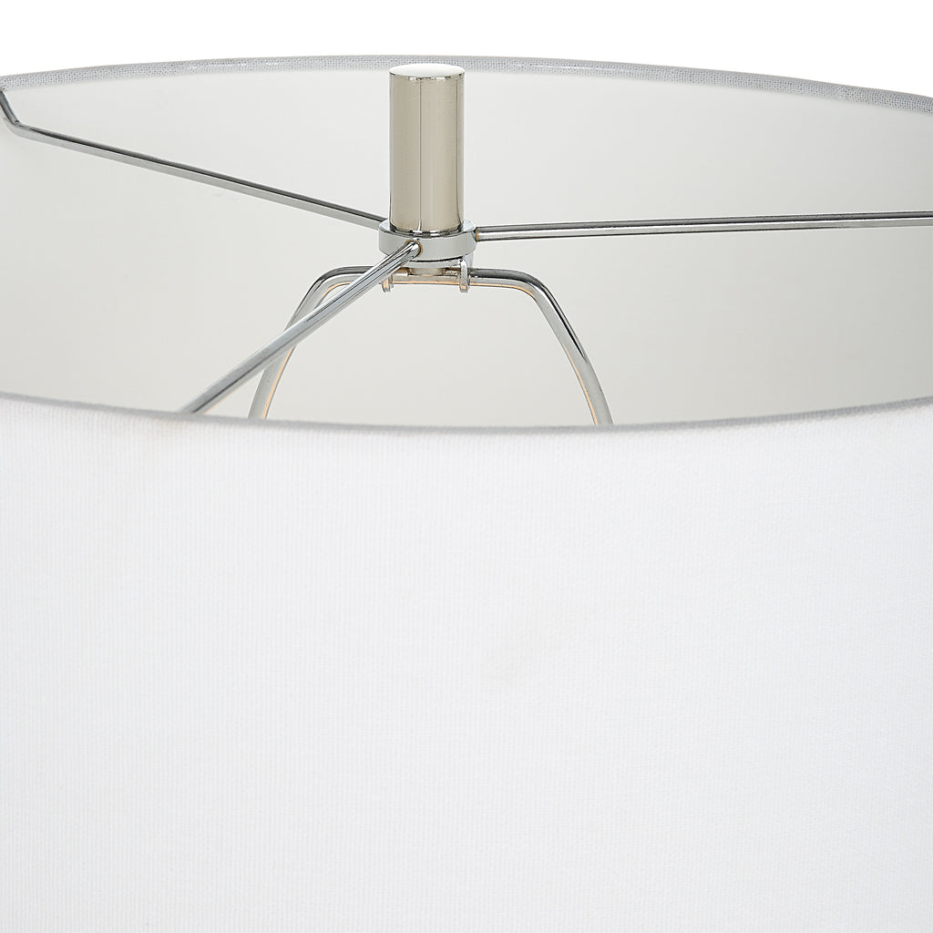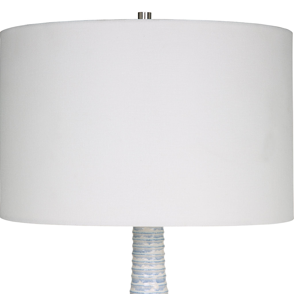 Material: This ceramic table lamp features an elegant fluted shape with ribbed texture finished in a soft blue and white drip glaze. The lamp sits on a thick crystal foot paired with polished nickel plated details.