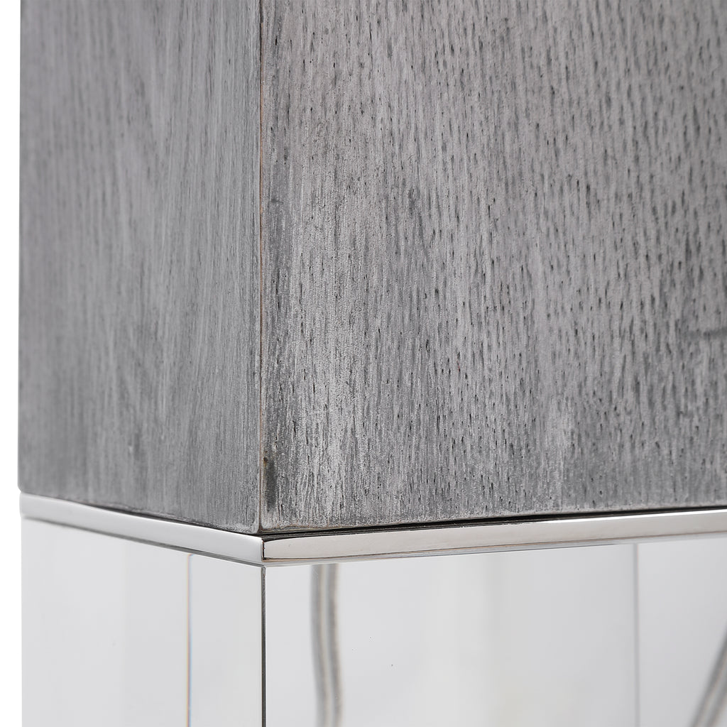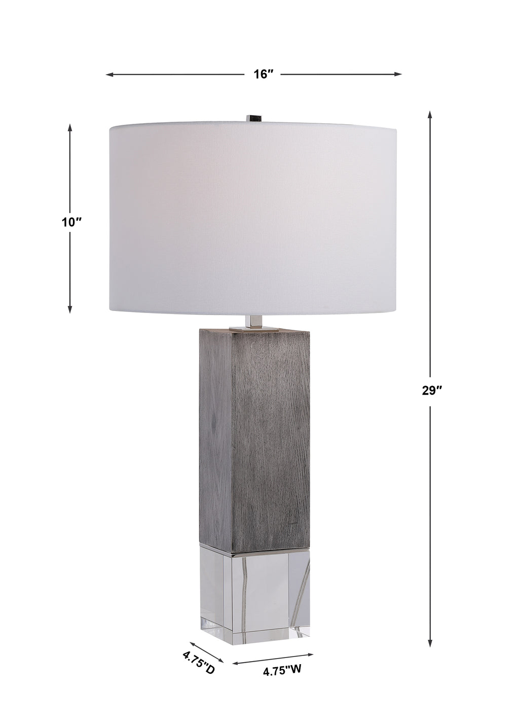 Material: Inspired by modern lodge style, this table lamp features a light gray oak look, accented by polished nickel plated details and a crystal foot that elevate the sophisticated design.