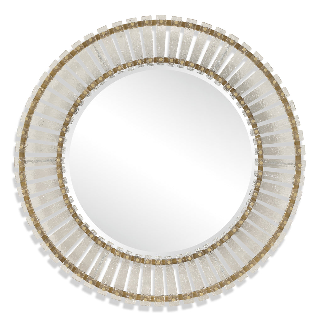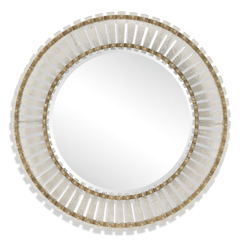 Material: The denali round mirror features textured glass keys suspended around brushed gold iron frames. Mirror has a generous 1" bevel.