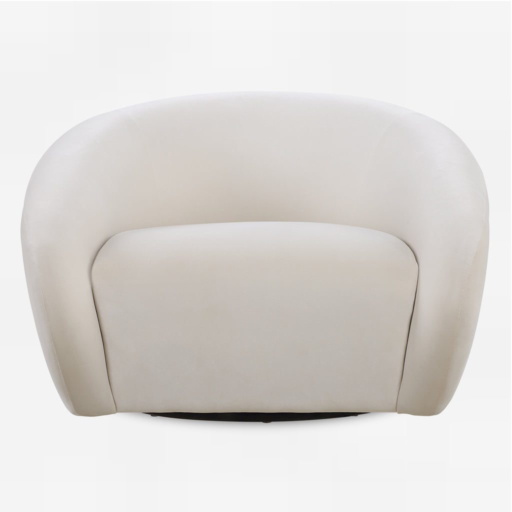 Material: A sleek and modern accent, featuring a wraparound back with dramatic waterfall arms and a swivel base. Fully upholstered in a cream polyester velvet.