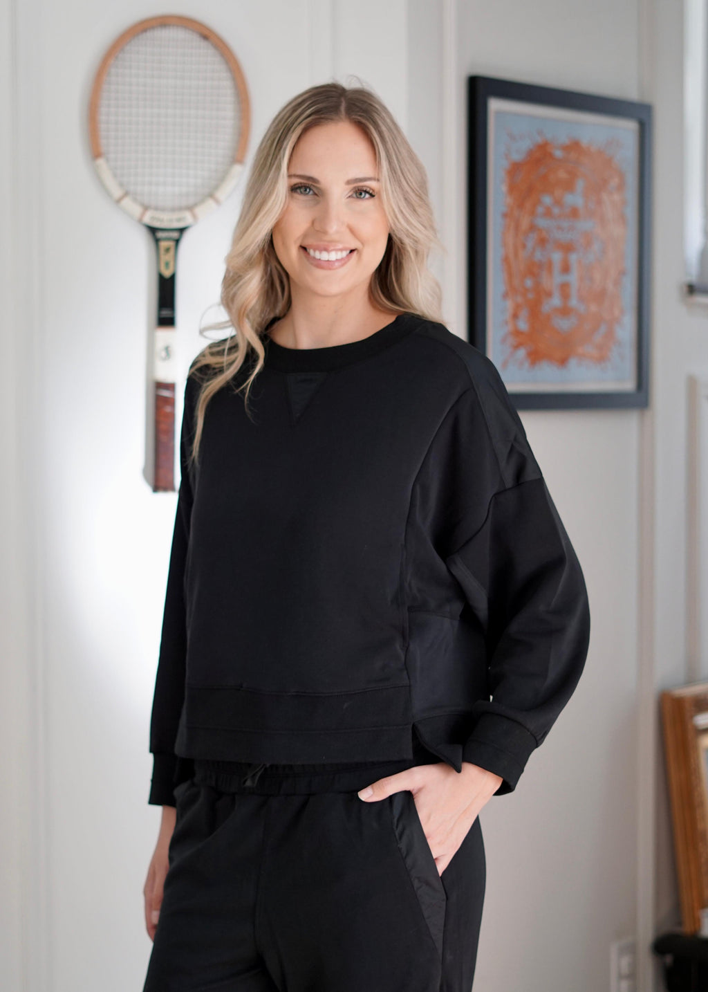 Style Features: Crew neckline with ribbed trim, relaxed fit, drop shoulders, and wide rib hem