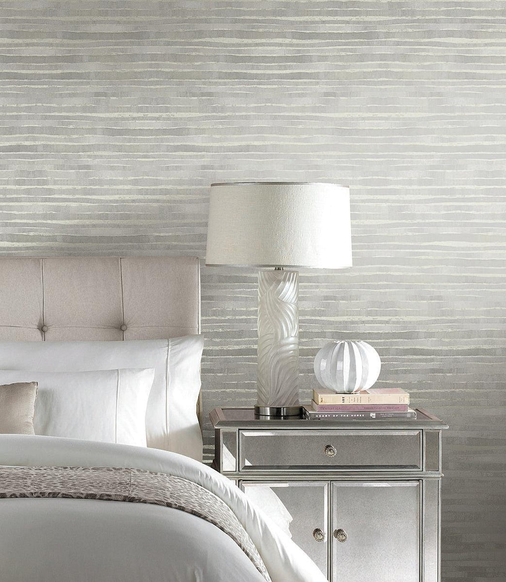 Ronald Redding wallcoverings artfully blend hertiage design with innovation to achieve the luxury of Modern Traditionalism. The 24 Karat collection exemplifies this blend of quiet sophisitcation and fine quality with the glamour of modern urban living. Pattern Dreamscapes' horizontal stripes of color and metallic create the feeling of a handcrafted mixed media art installation. This Dreamscapes Wallpaper measures approximately 27 inches wide by 27 feet long, covering About 60.8 square feet per roll. The horizontal stripes of pattern Dreamscapes creates a backdrop of textural glamour within a fine art mixed media landscape, punctuated with metallic shimmer.
