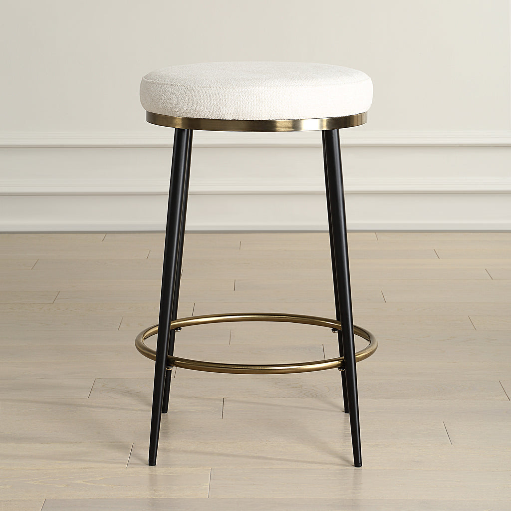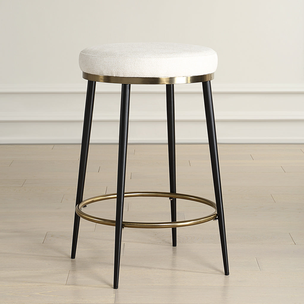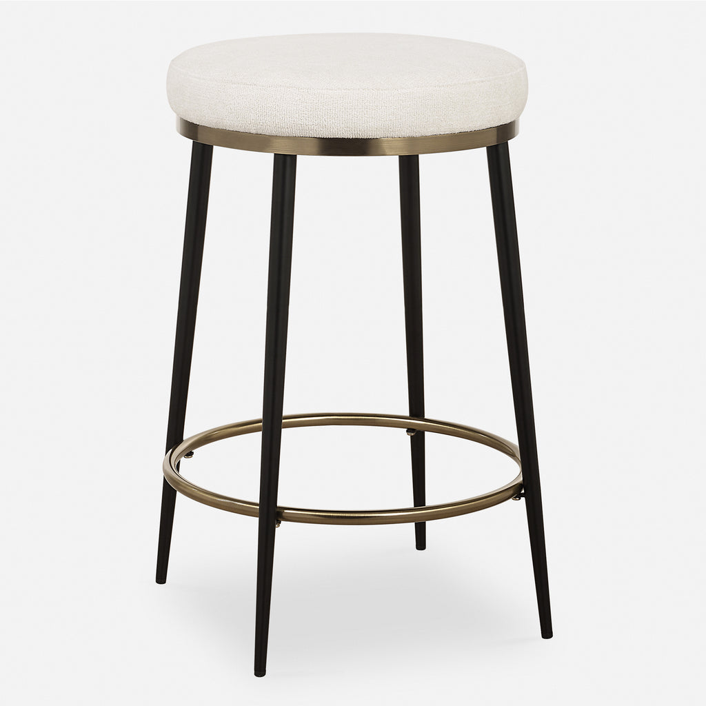 Material: A streamlined silhouette with sophisticated finishes of matte black and brushed brass. Topped with a plush cushion upholstered in a textured cream chenille.