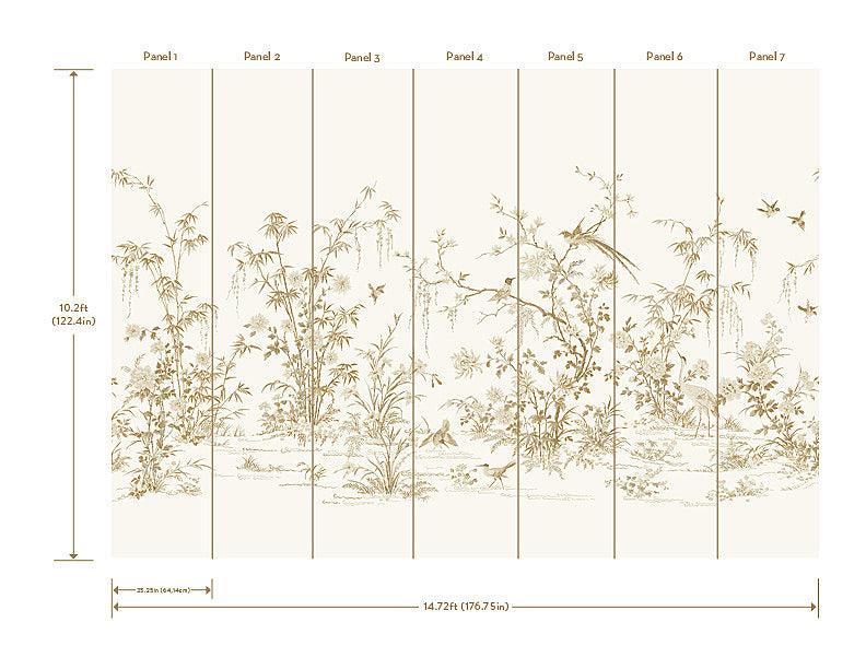 The Asian scenic landscape of a wetland's botanicals and birds flourish against a backdrop of majestic metallic shimmer in Flowering Vine Chinoiserie Mural. This Flowering Vine Chino Wall Mural measures approximately 25.25 inches wide by 10.2 feet long, covering 7 panels - Measures 14-ft 7-in wide by 10-ft 2-in when assembled per roll. Ronald Redding wallcoverings artfully blend hertiage design with innovation to achieve the luxury of Modern Traditionalism. The 24 Karat collection exemplifies this blend of quiet sophisitcation and fine quality with the glamour of modern urban living.