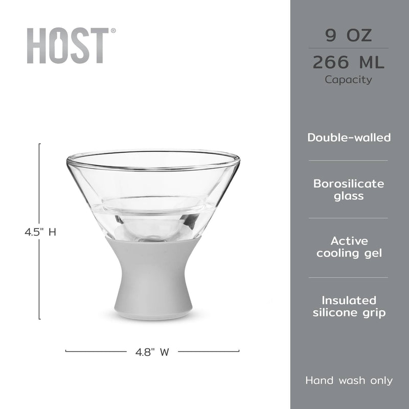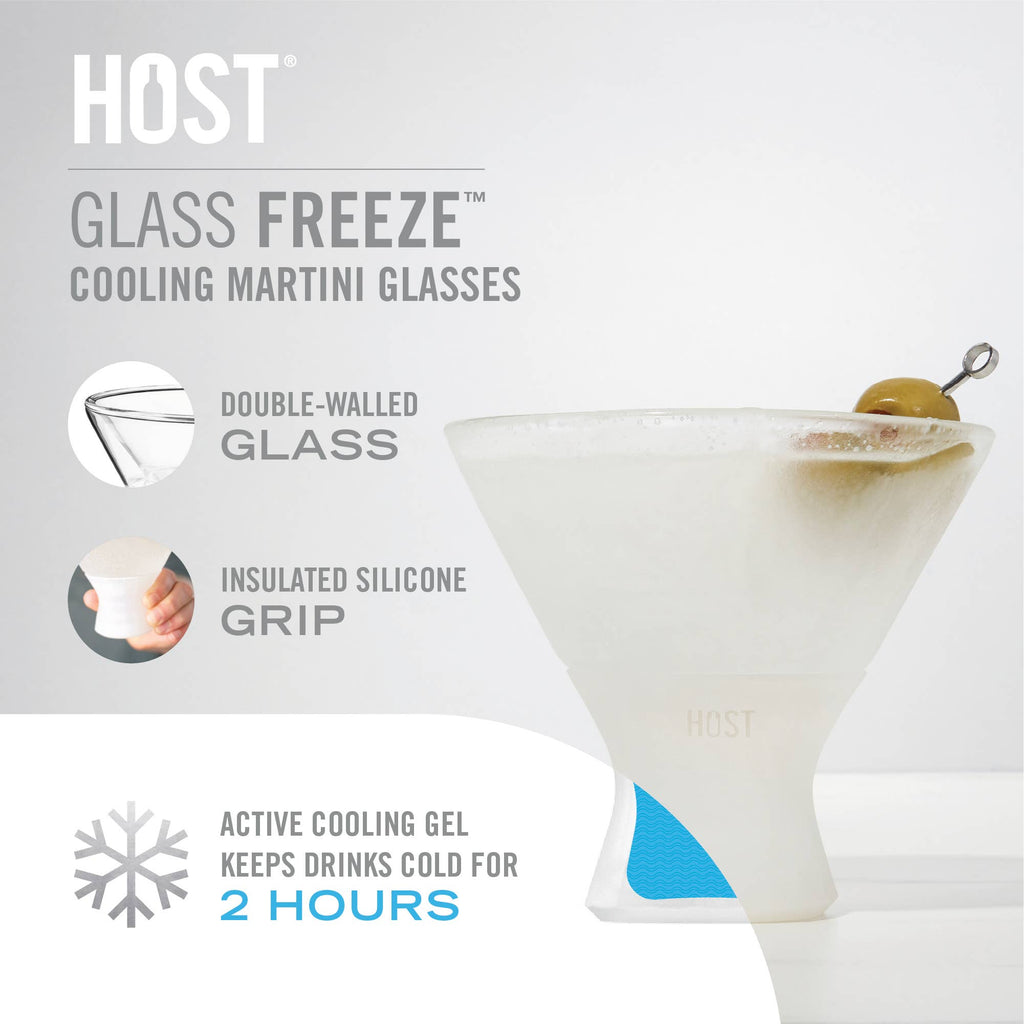 Whether you like your martini shaken or stirred, the Martini Glass FREEZE™ cooling glass keeps drinks at the optimal temperature. The active cooling gel inside the double-walled glass provides thermal insulation keeping drinks chilled at all times. Each glass is constructed with an insulated silicone band for comfortable handling. Quantity: 2 glasses Capacity: 9 oz. Materials: glass, silicone Design: insulated walls with active cooling gel Care: hand wash Directions: for the best results, place the martini freeze upside down in the freezer for 2 hours to allow the gel to evenly spread and freeze. HOST®, the embodiment of creativity and style, is your premier choice for any winter event that requires a blend of practicality and panache. Whether you are planning a Friendsgiving, looking for a stocking stuffer or need a white elephant gift for a NYE party, let HOST bring a spark to your seasonal celebrations.