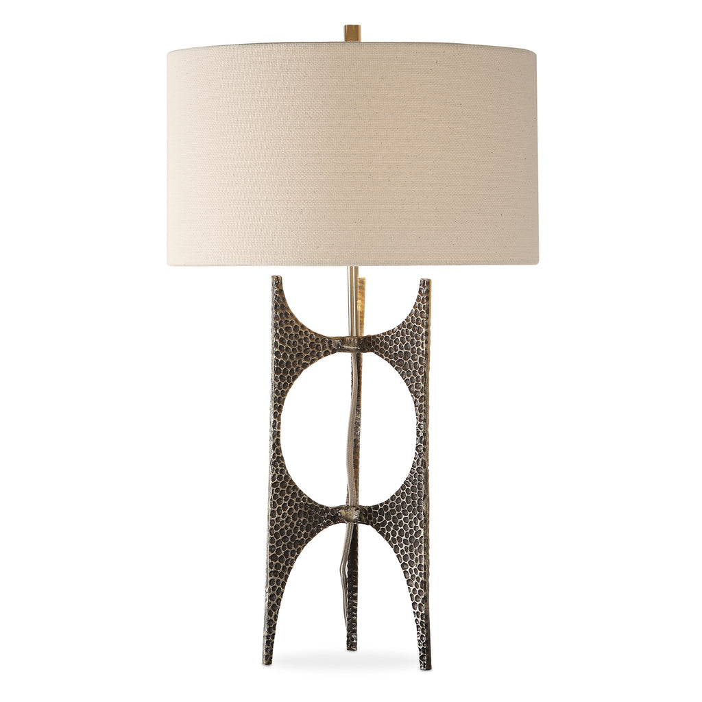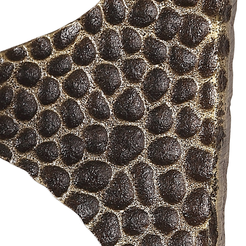 Material: This contemporary design is formed from cast iron featuring a deep hammered texture, finished in a heavily antique golden bronze, paired with an exposed, coordinating fabric covered cord.
