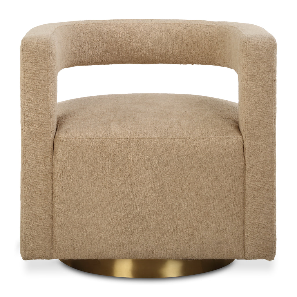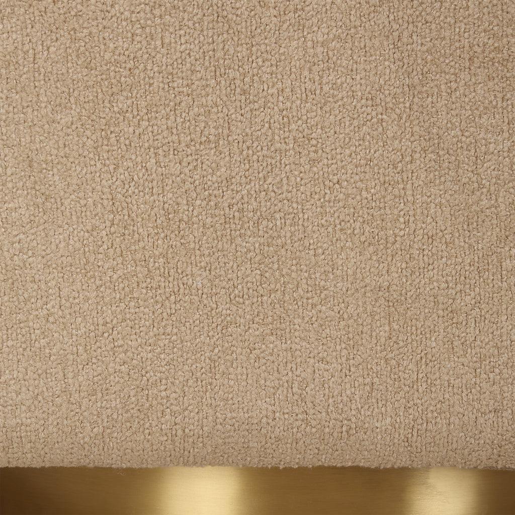 Material: A luxuriously modern style created by the floating barrel back design, upholstered in a textured boucle fabric in toast. Features a plinth swivel base in brushed brass plated stainless steel.