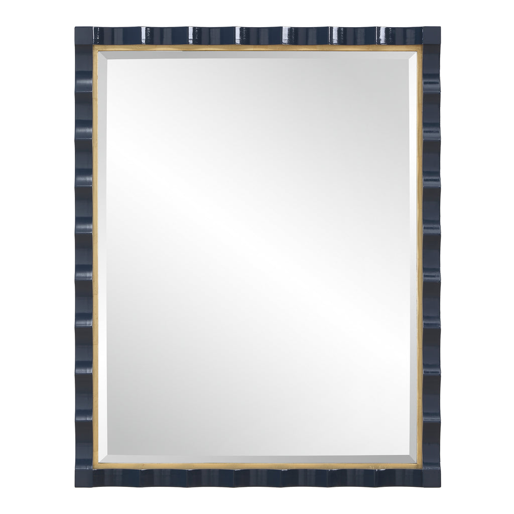 Material: Elegantly designed with a scalloped edge and a stunning gold leaf inner liner, this piece is beautifully finished in a rich, high-gloss navy lacquer. Perfect for adding a touch of luxury and depth to any room, the gulf mirror blends classic charm with a modern twist. A generous 1" bevel is added to this piece, which may be hung horizontal or vertical.