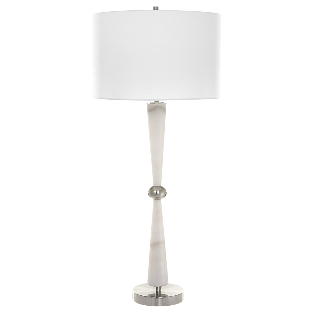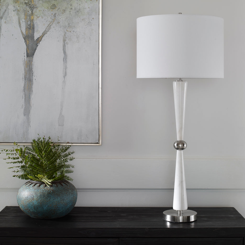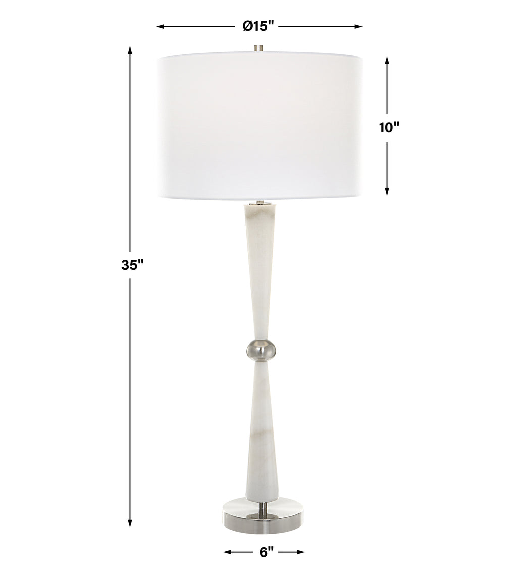 Material: Timeless and sophisticated, this table lamp boasts tapered white marble with subtle gray veining, accented by iron details finished in brushed nickel.