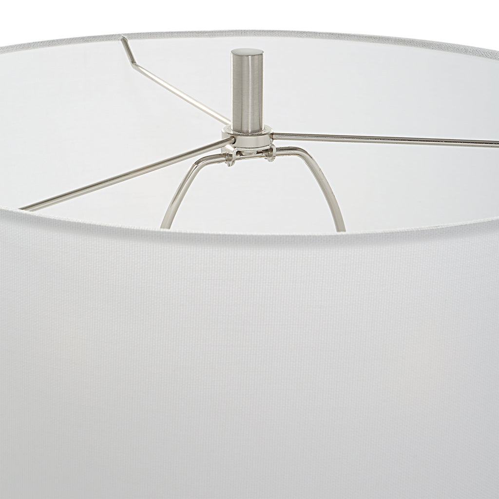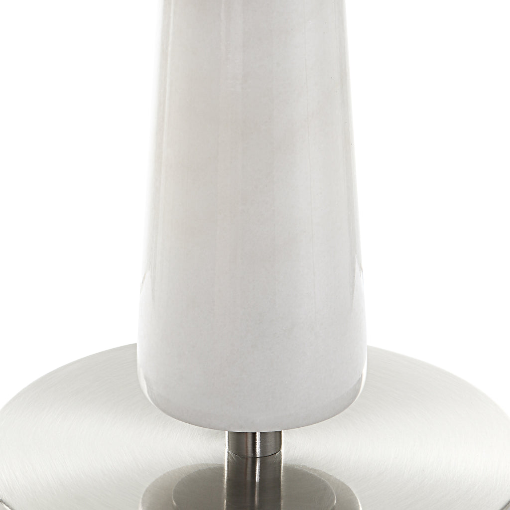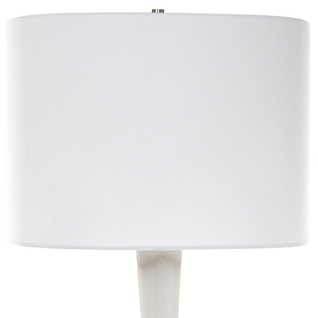 Material: Timeless and sophisticated, this table lamp boasts tapered white marble with subtle gray veining, accented by iron details finished in brushed nickel.