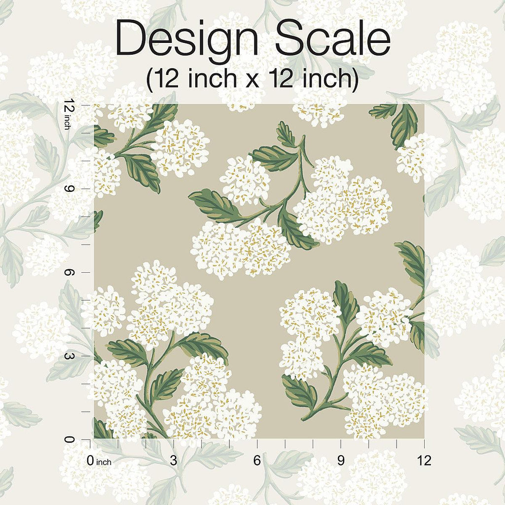 This Hydrangea Wallpaper measures approximately 27 inches wide by 27 feet long, covering About 60.8 square feet per roll.