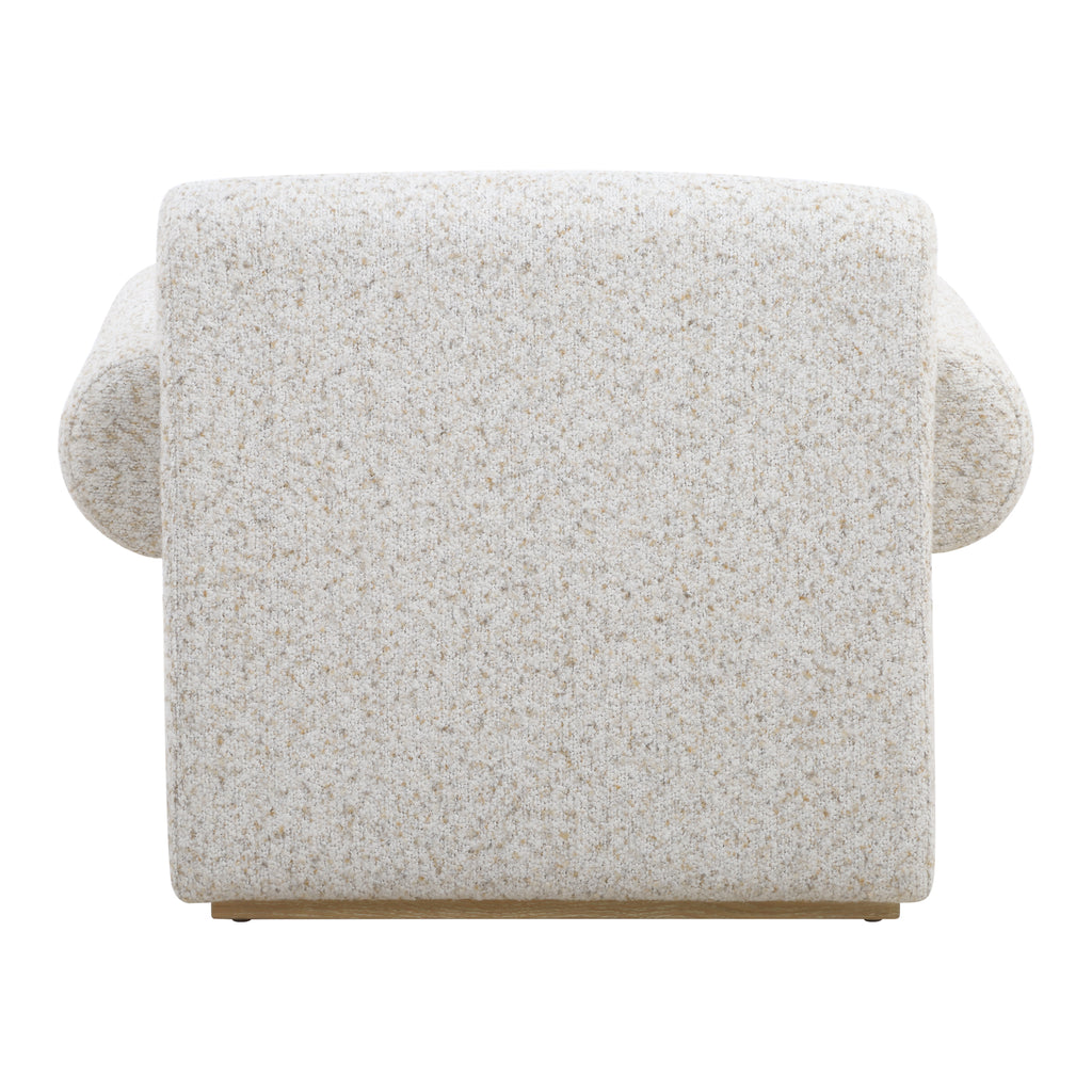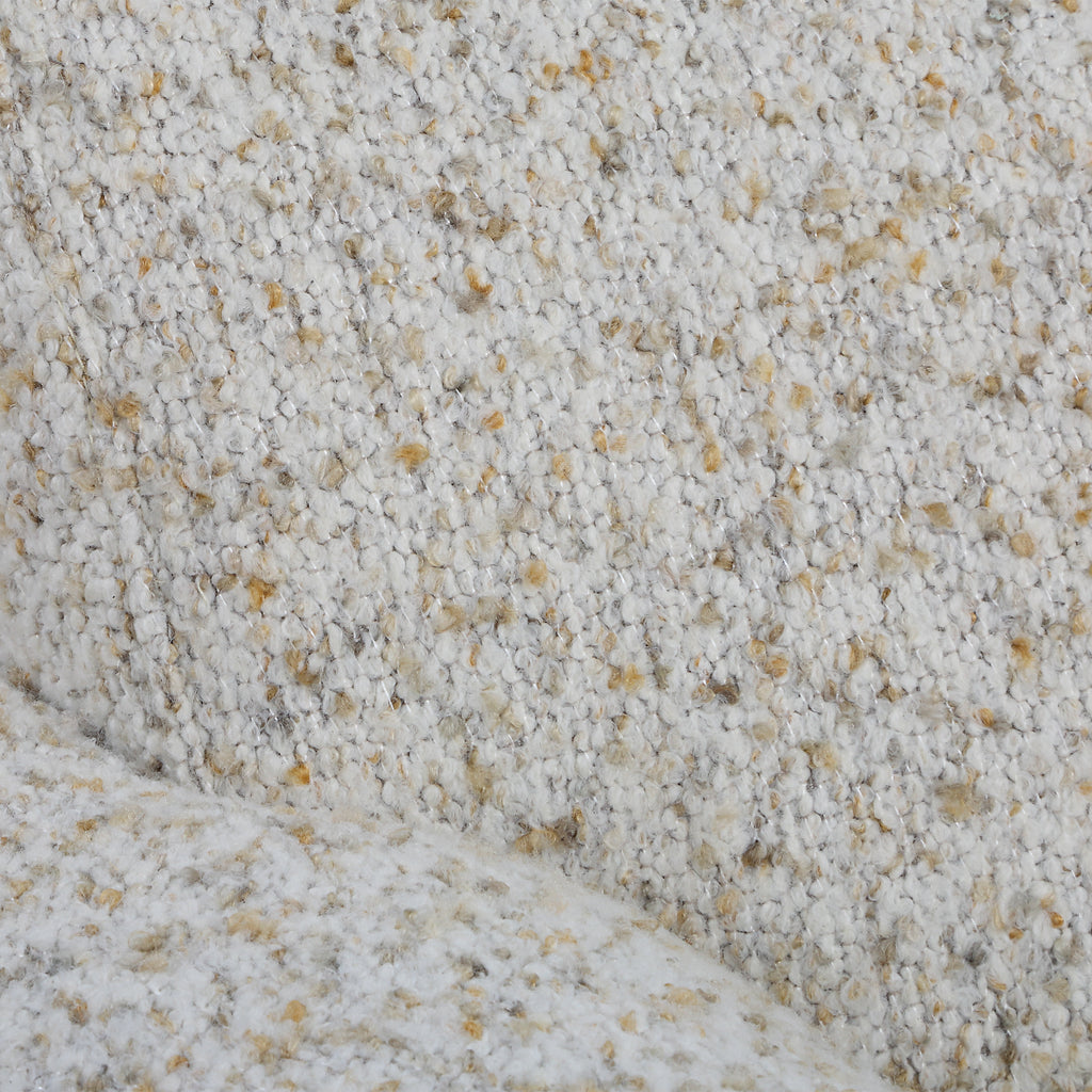Material: Rolled arms of the juncture accent chair encapsulate the decorative legs in solid oak with a natural finish. Fully upholstered in a textured boucle with tones of flax, ivory, caramel and taupe.