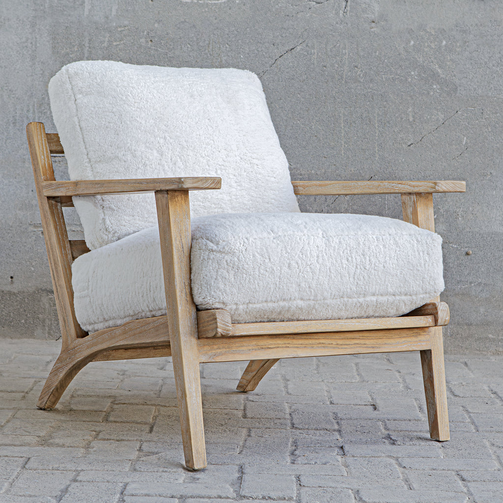 Material: Relax in the laid back lounge chair, solidly constructed from mindi wood in a natural finish. Plush cushions are upholstered in an ultra soft, white faux sheepskin fabric. Seat height is 20".