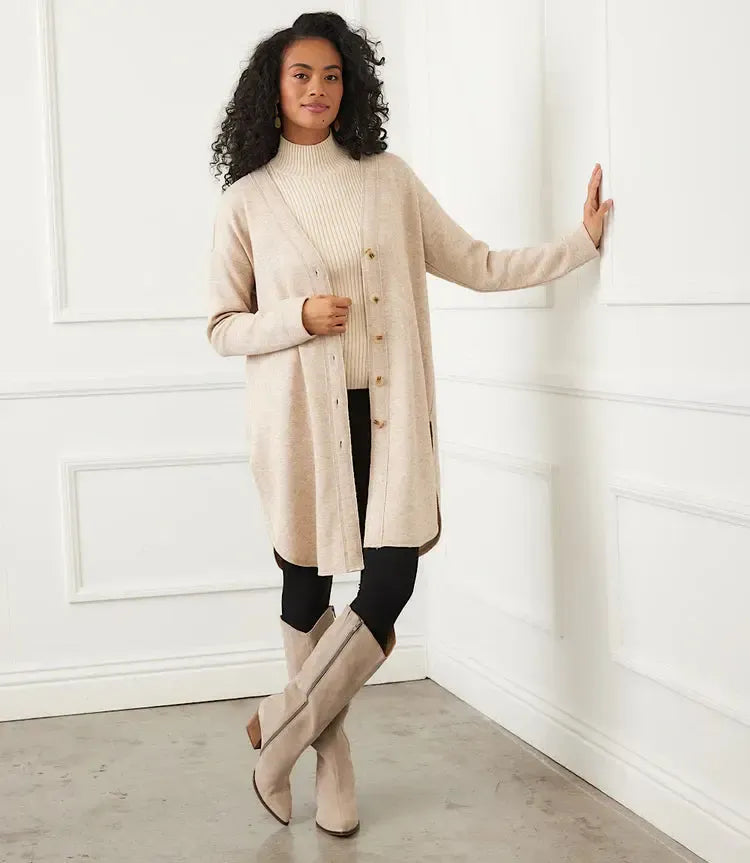 Relaxed through the body with a longer length and slightly fitted sleeves.