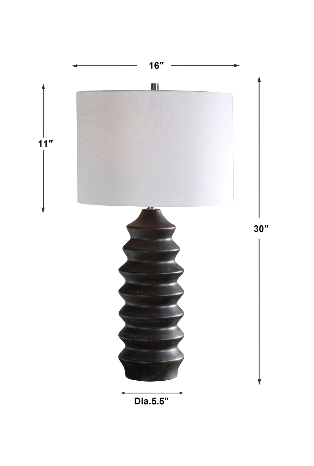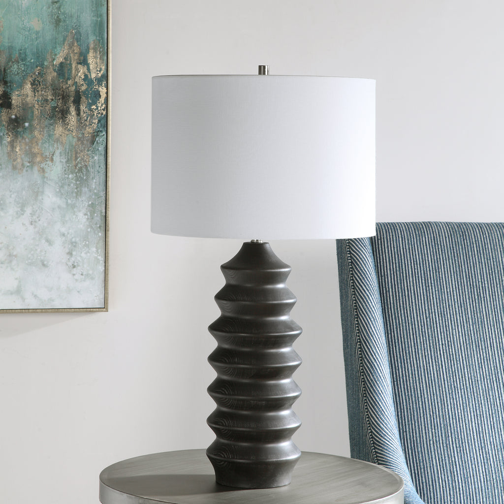 Material: Showcasing a modern lodge style, this table lamp features a carved wood base finished in a rustic black stain exposing subtle wood grain, accented with brushed nickel plated details.