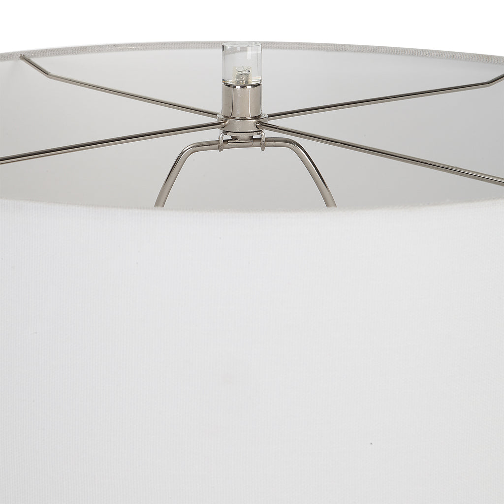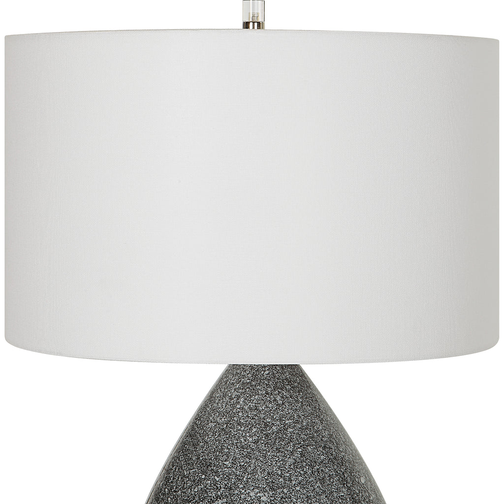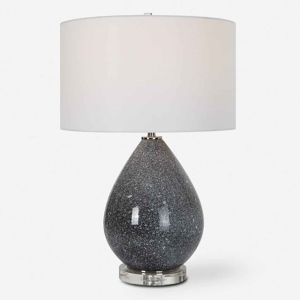 Material: This ceramic table lamp displays a unique black and white speckled glaze with polished nickel plated accents and a thick crystal foot.