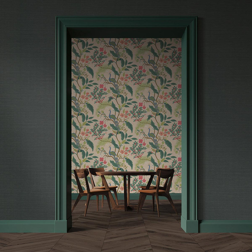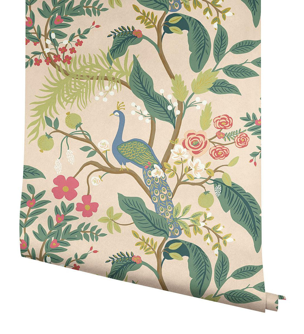 The debut collection from Rifle Paper Co. is timeless, inviting, and filled with their signature florals, expressive illustrations, and custom-colored sisals—each designed to bring unexpected beauty into the real world. In this modern take on traditional chinoiserie motifs by Rifle Paper Co., magnificent peacocks perch on winding branches, surrounded by bright blooming flowers and emerald leaves. This Peacock Wallpaper measures approximately 27 inches wide by 27 feet long, covering About 60.8 square feet per roll. Durable and easy to remove from primed walls, this friendly to hang unpasted nonwoven wallpaper is created with a special blend of synthetic fibers, making it both easy to hang and tear resistant.