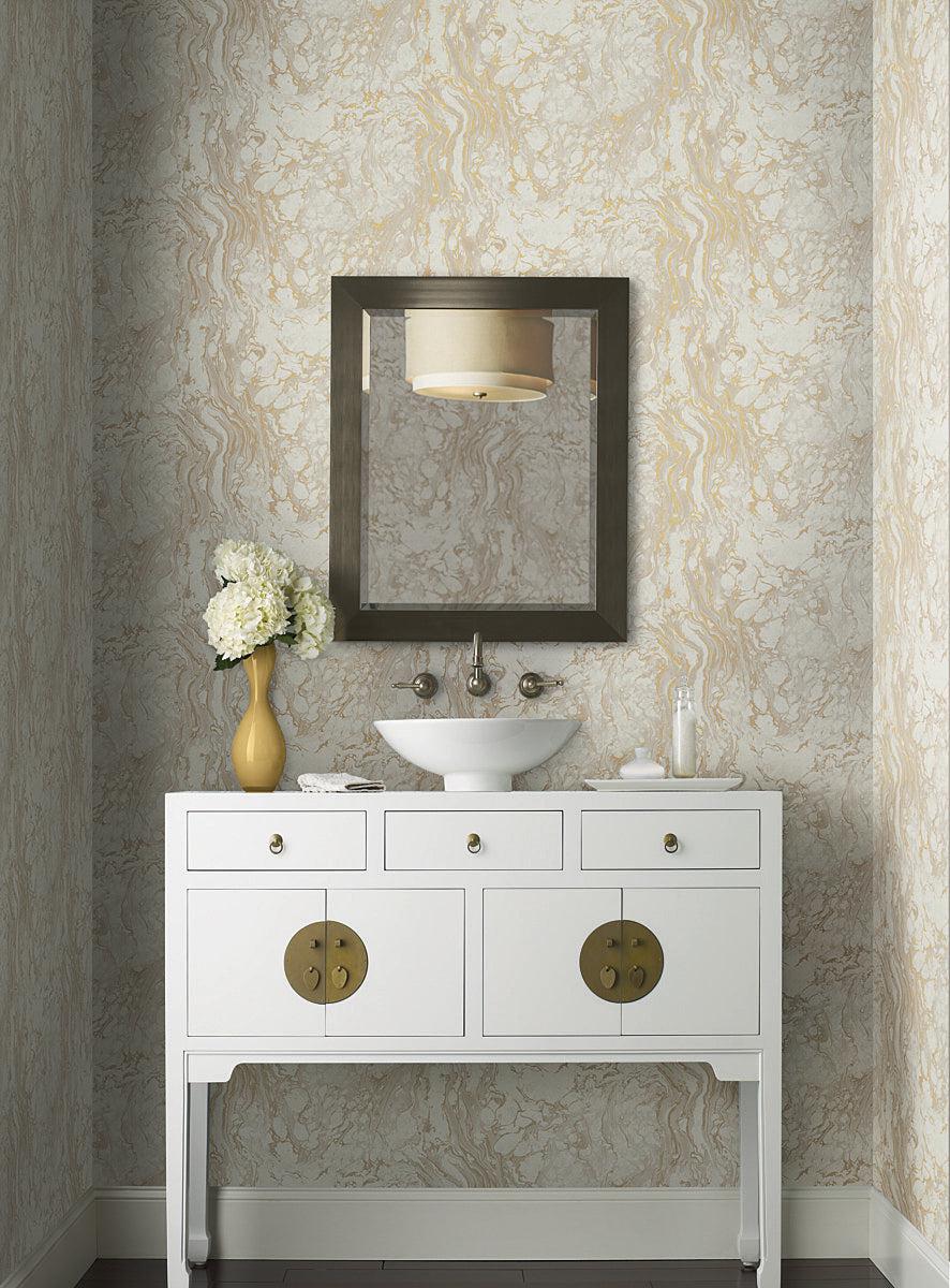 Ronald Redding wallcoverings artfully blend hertiage design with innovation to achieve the luxury of Modern Traditionalism. The 24 Karat collection exemplifies this blend of quiet sophisitcation and fine quality with the glamour of modern urban living. Pattern Polished Marble brings all the beautiful graining of this architectural stone classic to a distinctively new modern interpretation. This Polished Marble Wallpaper measures approximately 27 inches wide by 27 feet long, covering About 60.8 square feet per roll. Renowned for its classical beauty and characteristic mineral graining, pattern Polished Marble expresses the luxury and charm of this iconic crystalline mainstay in modern color and metallic shine.