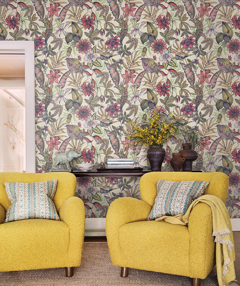 Created to cover the diversity and overarching themes which drive the home decor industry, the York Wallcovering brand creates an umbrella of distinctive design options for walls inspired by social, trend and fashion influences. The smaller denizens of the tropics climb amidst lush flowers and foliage in pattern Rainforest featured in a bright multi color with a cream background. This Rainforest Wallpaper measures approximately 27 inches wide by 27 feet long, measuring approximately 60.8 square feet per roll. Florals speak the language of ever-evolving style with instant connection and iconic form that confidently compliments any space and every design signature.