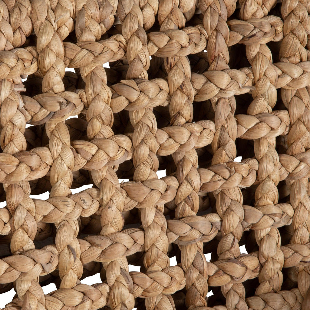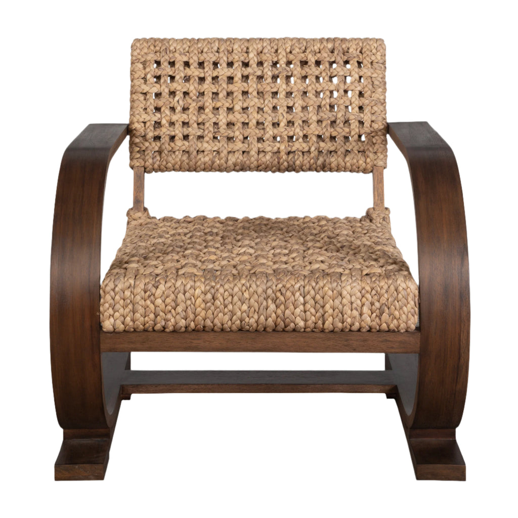 Material: A modern bohemian accent, featuring a natural woven water hyacinth seat on a curved solid wood frame giving flexible movement, layered in a teak veneer in warm walnut.