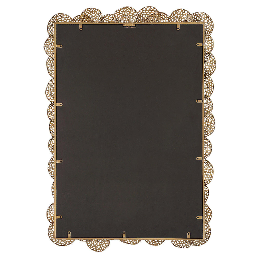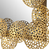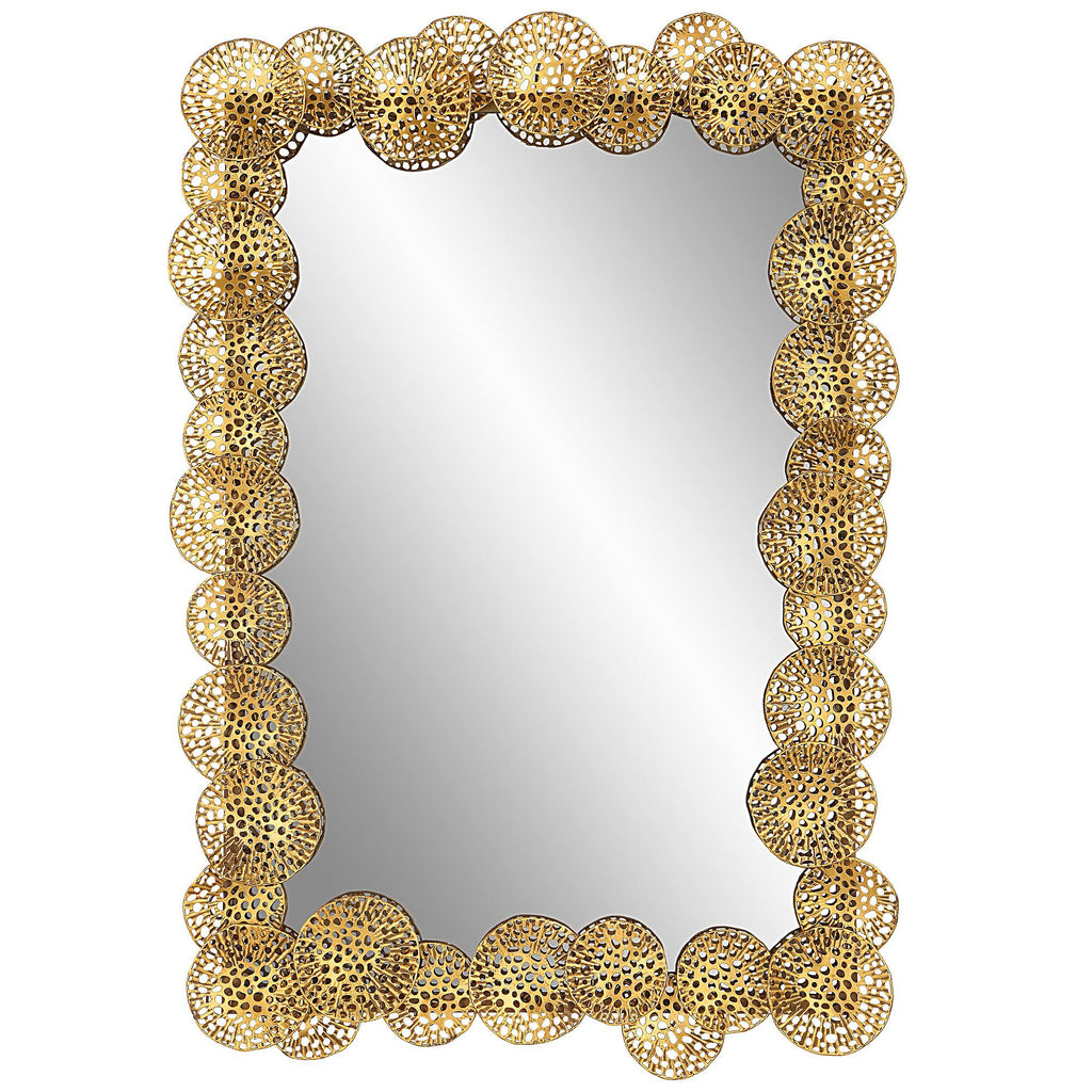 Material: Resembling layered lotus leaves, this mirror shows off a pierced metal frame finished in a rich gold finish. May be hung horizontal or vertical.