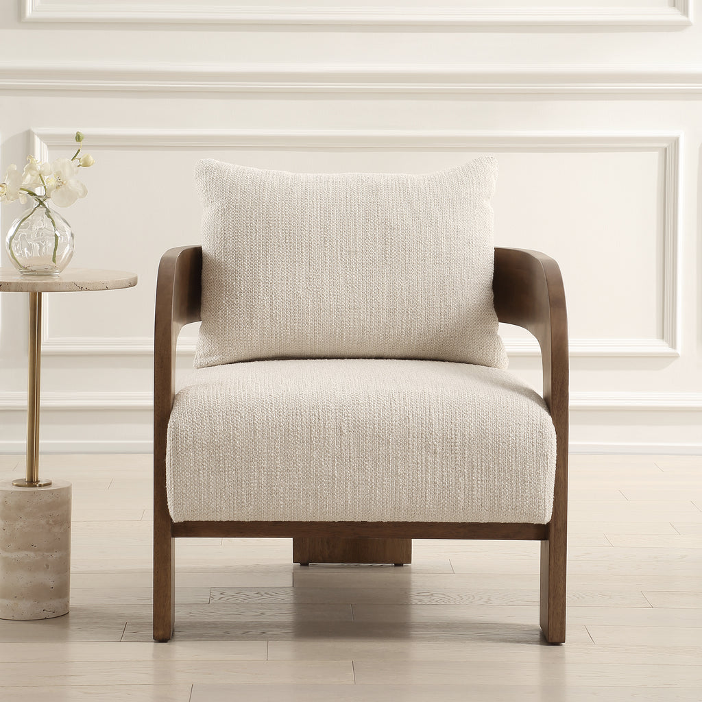 Material: Drawing you in from any direction, the beautiful solid wood frame of the rowan chair features a t back design finished in walnut stained oak. The contrasting plush seat and back are upholstered in a textured ivory boucle.