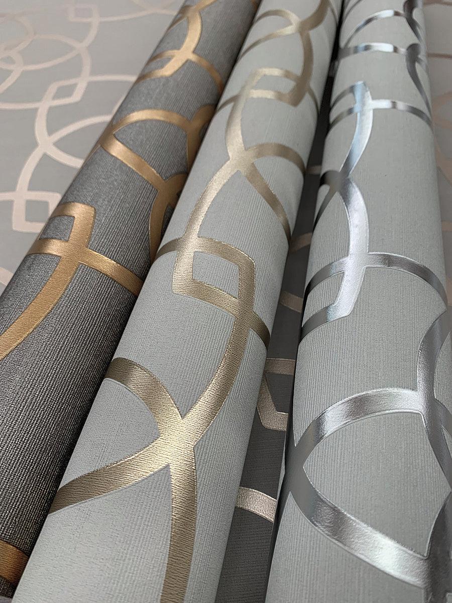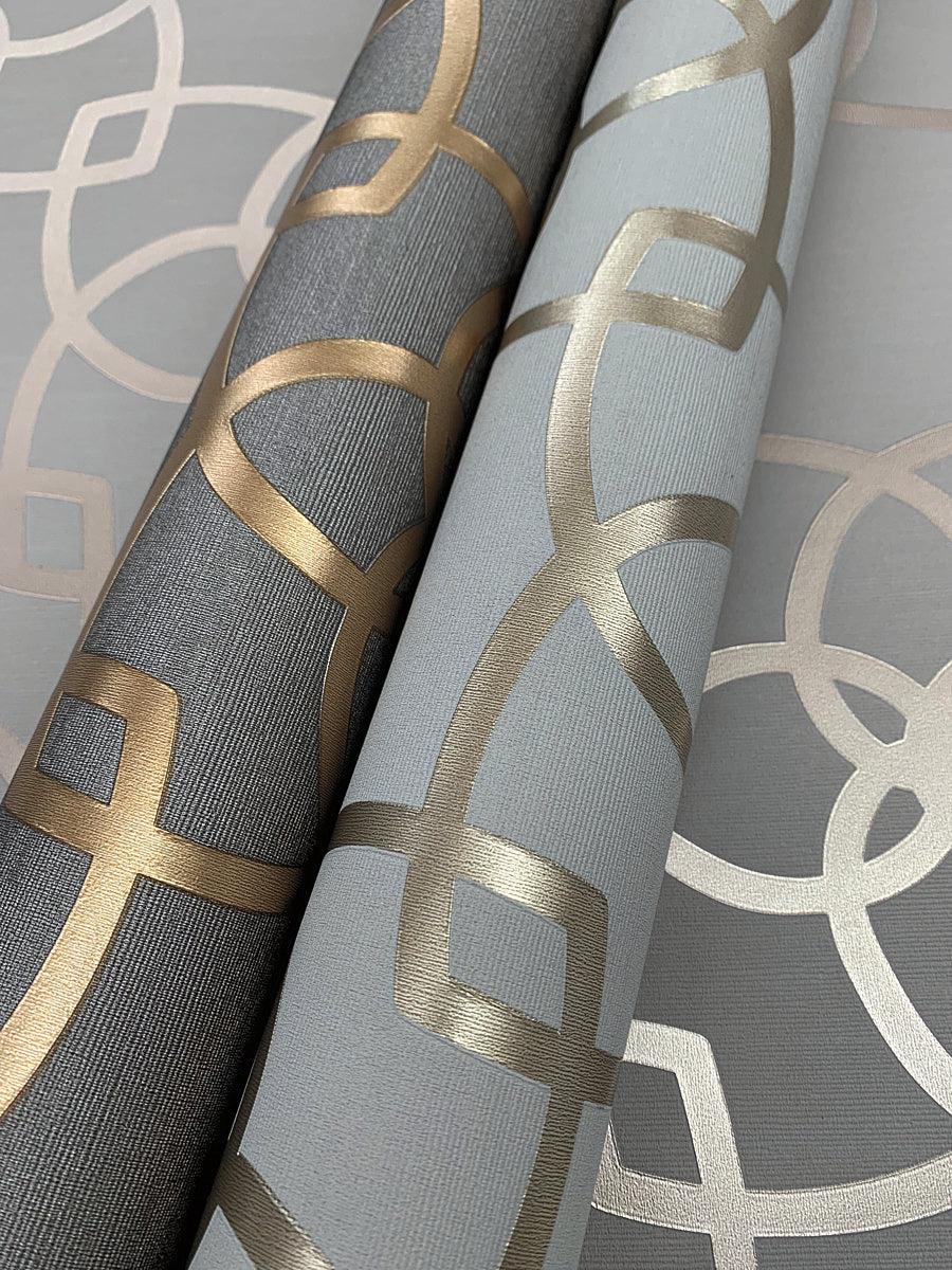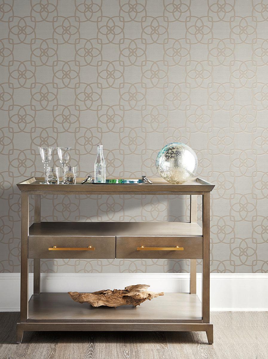Interwoven geometric shapes, nearly seven inches square, are linked together to form diagonal chains. The contrast of matte ink with metallic sheen creates a lightly textured contemporary design. Among the six scintillating color combinations is metallic coral on taupe or palest grey with gleaming silver. Sisal (Y6200901 – Y6200911) is the perfect partner. This Serendipity Wallpaper measures approximately 21 inches wide by 33 feet long, covering About 57.8 square feet per roll.