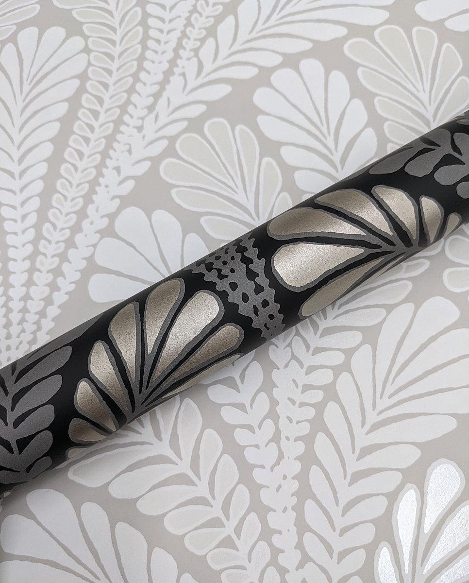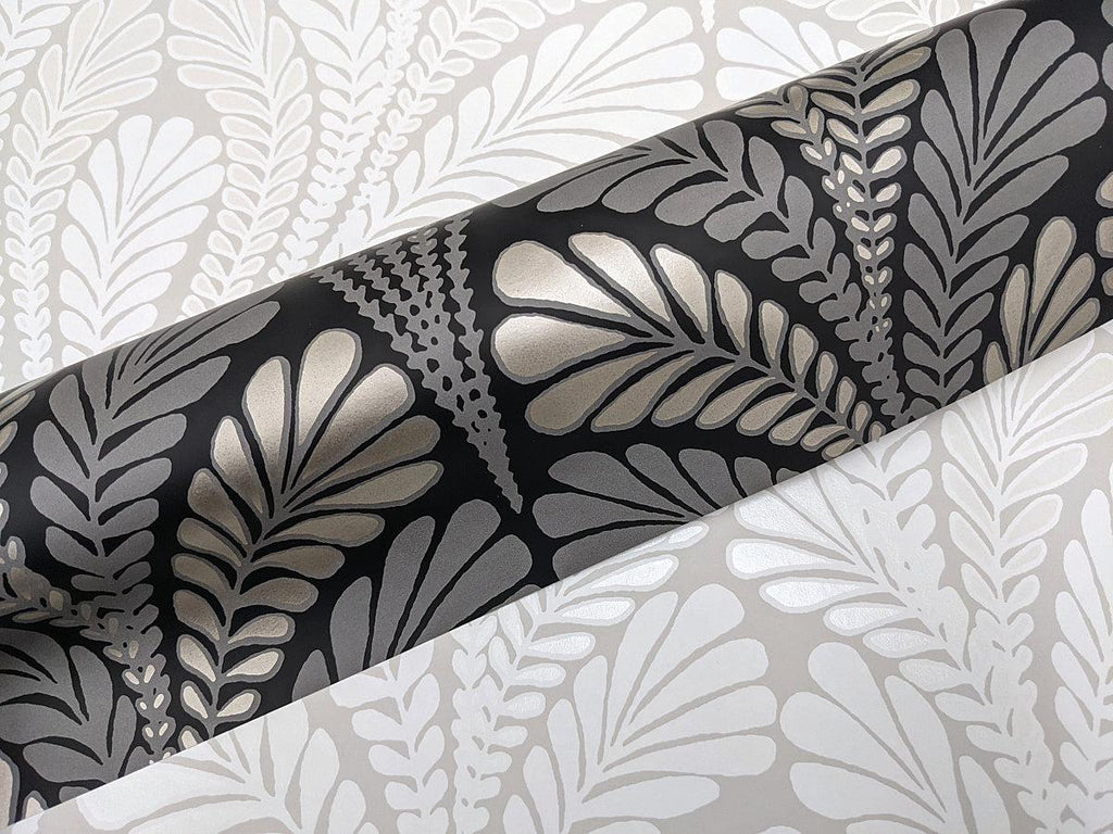A perfect pairing of quintessential opposites, the Black and White Resource Library is a mix of the best in classic style and current trends curated into one timeless color compendium. Luminous metallic inks add shimmer to the pattern of Shell Damask’s feathery arching ferns. This Shell Damask Wallpaper measures approximately 20.5 inches wide by 33 feet long, covering About 56.4 square feet per roll. Manufactured on Sure Strip™, a unique high performance substrate, this ultra-easy removable wallpaper is guaranteed easy to install and easy to remove; simply use water to activate.