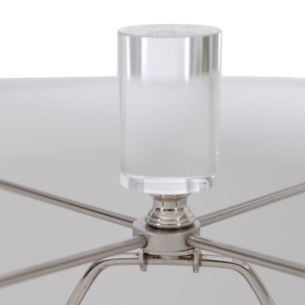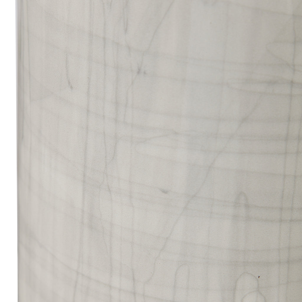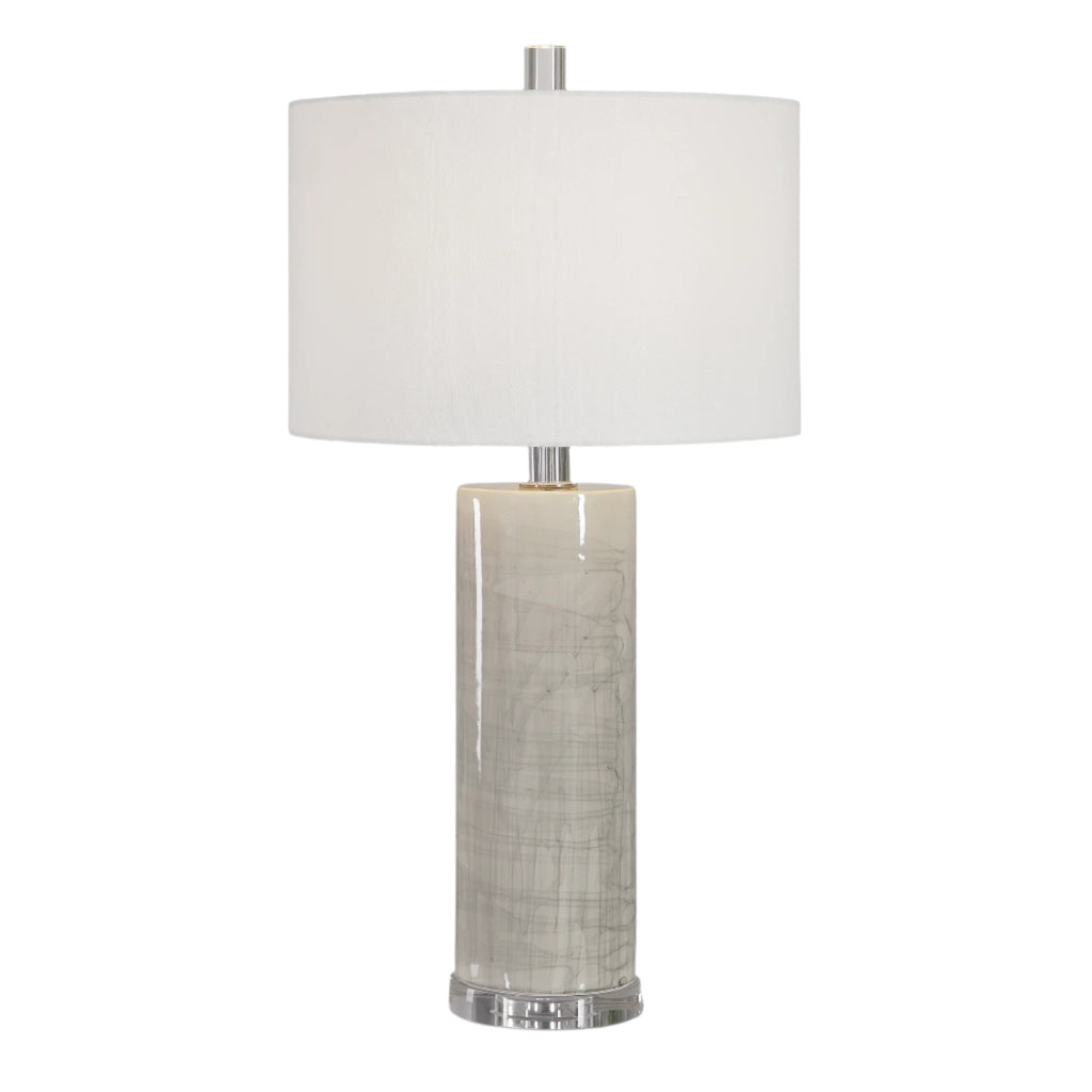Material: Modern in design, this ceramic table lamp showcases a neutral beige glaze with an abstract gray drip pattern, paired with elegant crystal details and polished nickel plated accents.